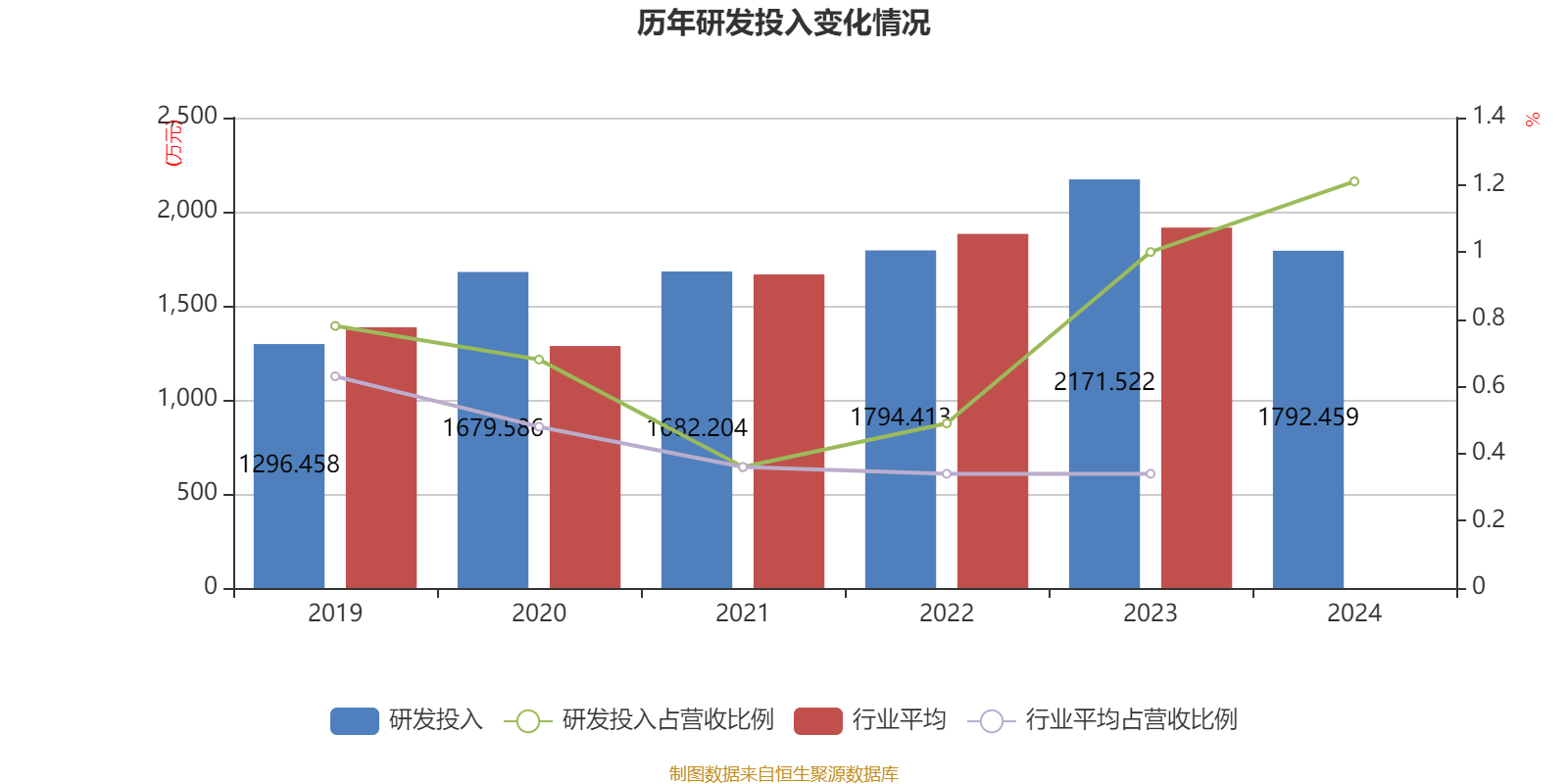 2024年全年,公司研发投入金额为1792.46万元,同比下降17.46%;研发投入占营业收入比例为1.21%,相比上年同期上升0.21个百分点。此外,公司全年研发投入资本化率为0%。