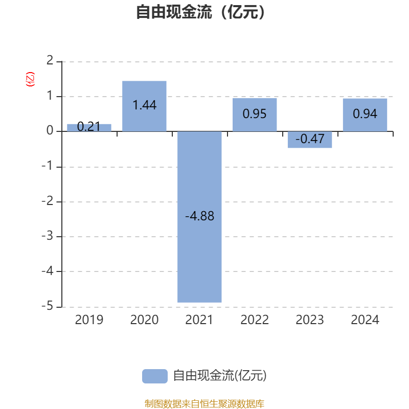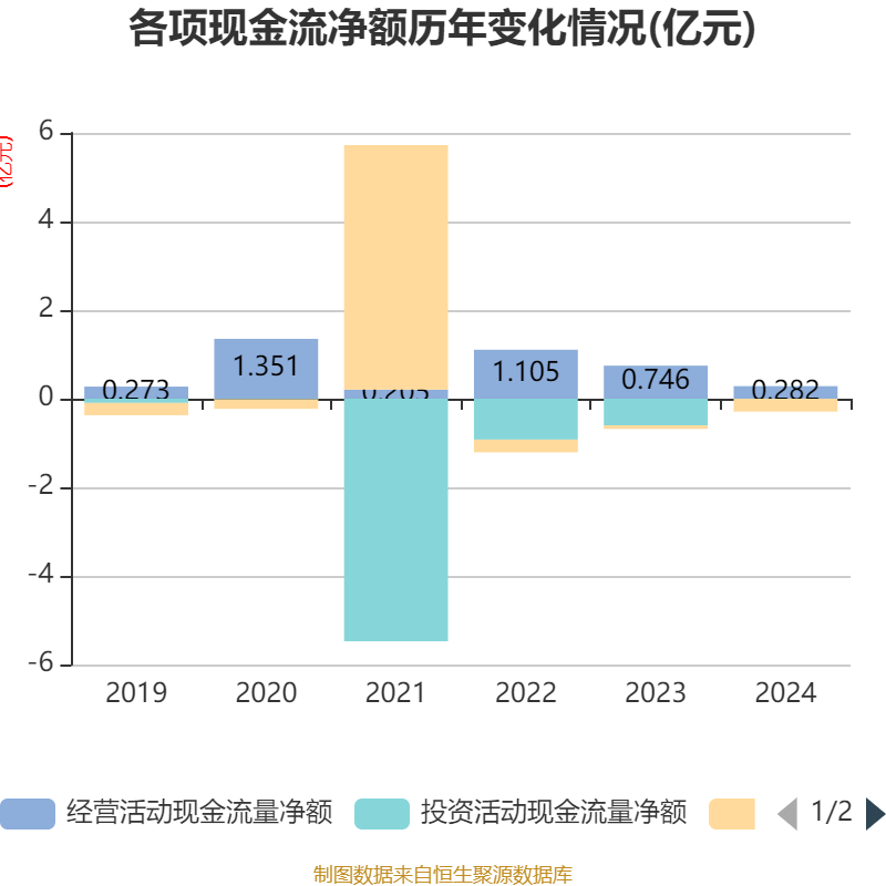 截至2024年,公司经营活动现金流净额为2818.46万元,同比下降62.22%;筹资活动现金流净额-2908.04万元,同比减少2095.61万元;投资活动现金流净额30.97万元,上年同期为-6009.45万元。