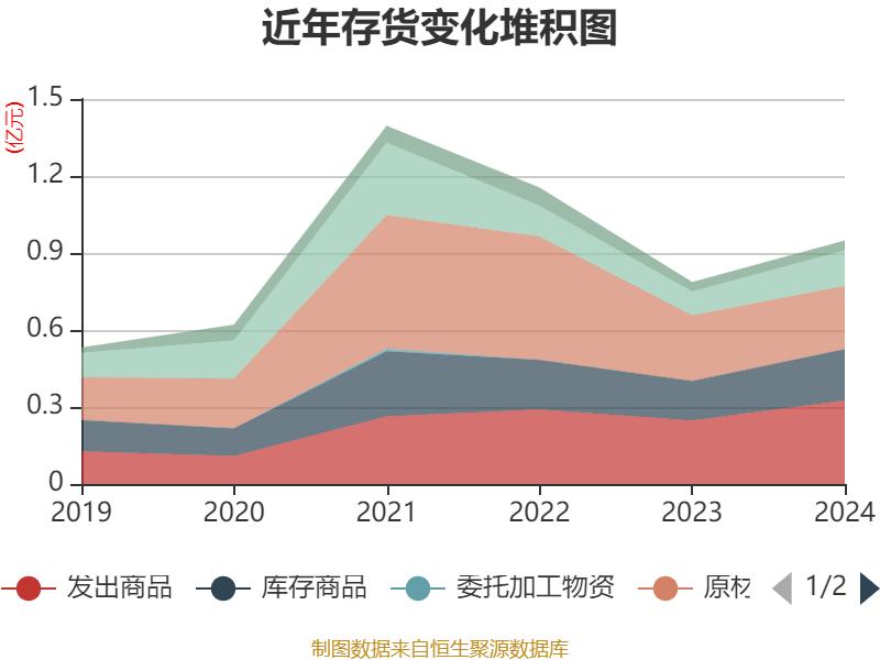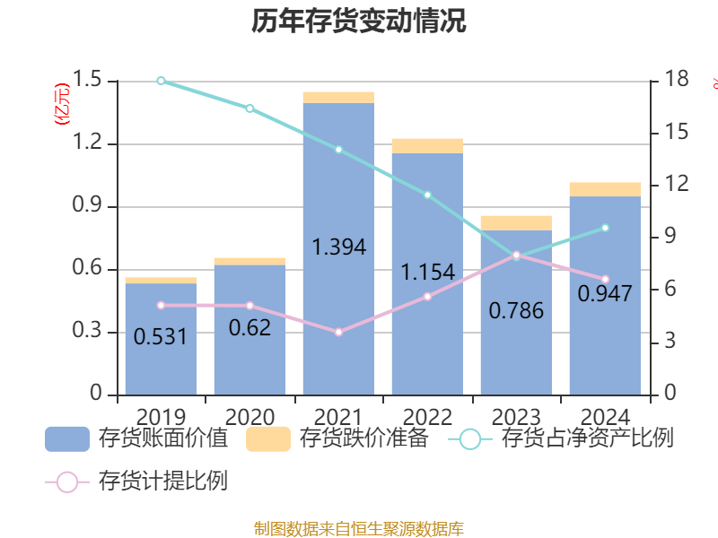 从存货变动来看,截至2024年末,公司存货账面价值为9467.46万元,占净资产的9.56%,较上年末增加1612.06万元。其中,存货跌价准备为669.97万元,计提比例为6.61%。