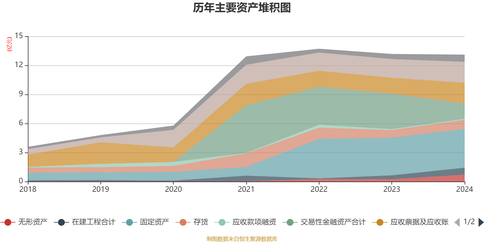 资产重大变化方面,截至2024年末,公司交易性金融资产合计较上年末减少56.93%,占公司总资产比重下降15.8个百分点;应收票据及应收账款较上年末增加31.19%,占公司总资产比重上升3.96个百分点;无形资产较上年末增加188.06%,占公司总资产比重上升3.52个百分点;在建工程合计较上年末增加86.33%,占公司总资产比重上升2.56个百分点。